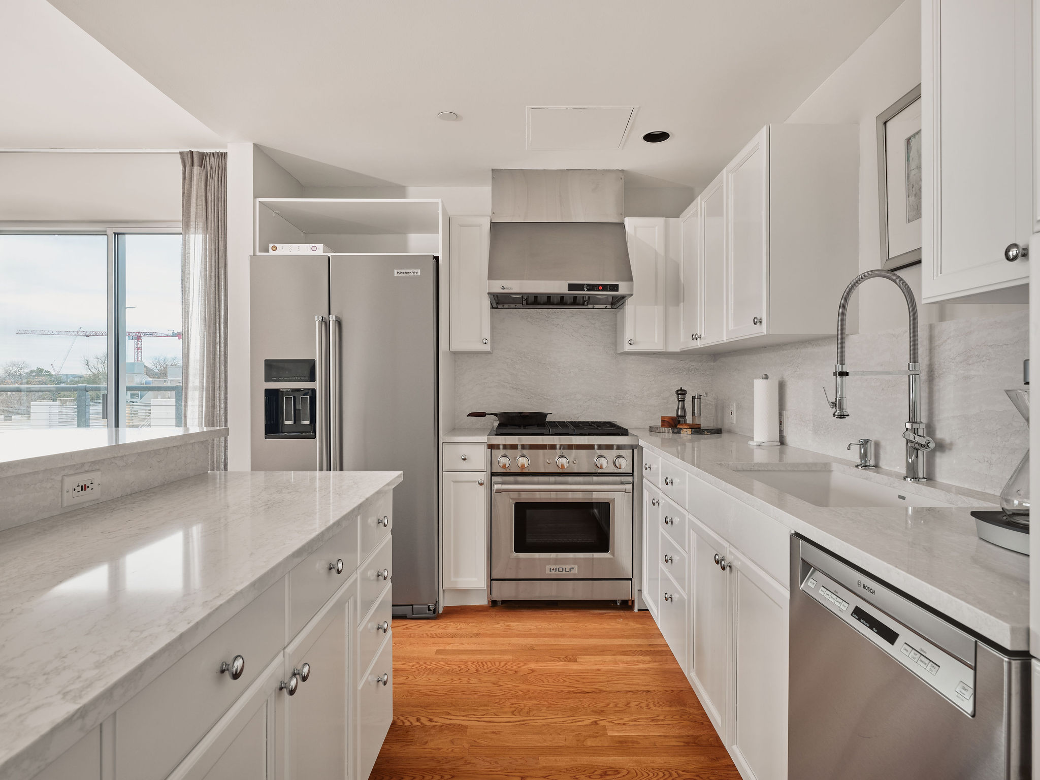This refined 2-bedroom, 2.5-bath residence with a dedicated office has been recently refreshed throughout. Light-filled living and dining areas flow seamlessly into a thoughtfully remodeled kitchen featuring Cambria Ironsbridge quartz countertops, Wolf gas range, a center island, and breakfast bar—ideal for both everyday living and entertaining.