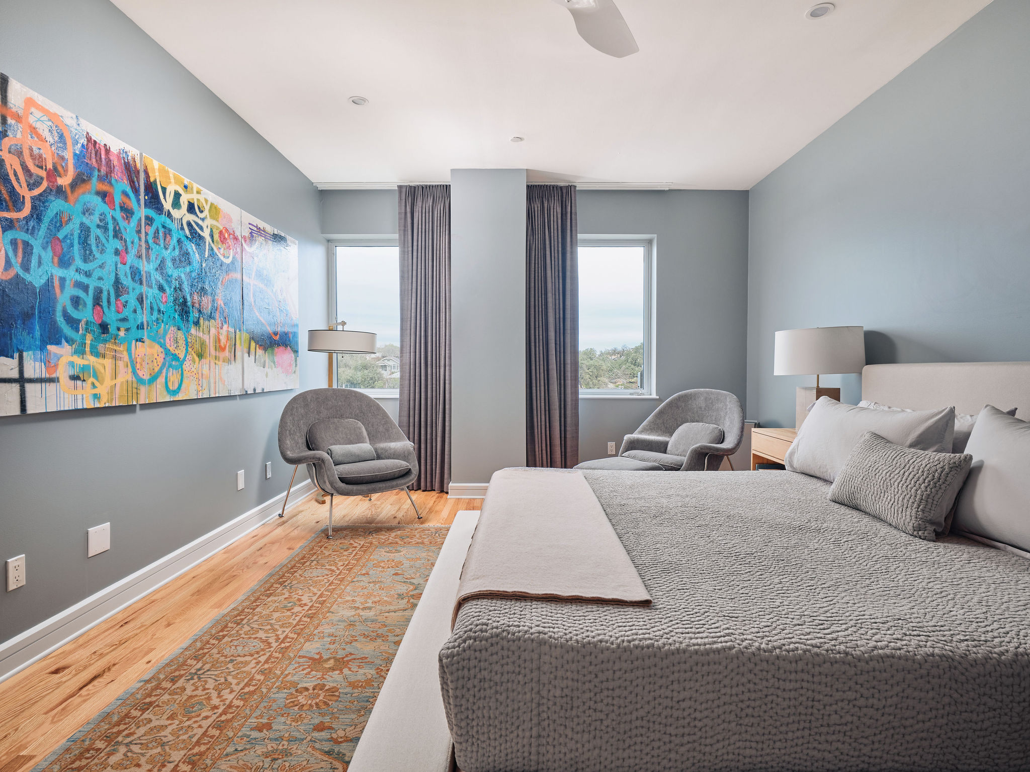 Refinished hardwood floors, custom linen window treatments, and a bespoke built-in bar cabinet by Grandeur Cellars add warmth and sophistication to the living space, while the office includes a custom full-size built-in refrigerated wine storage unit.