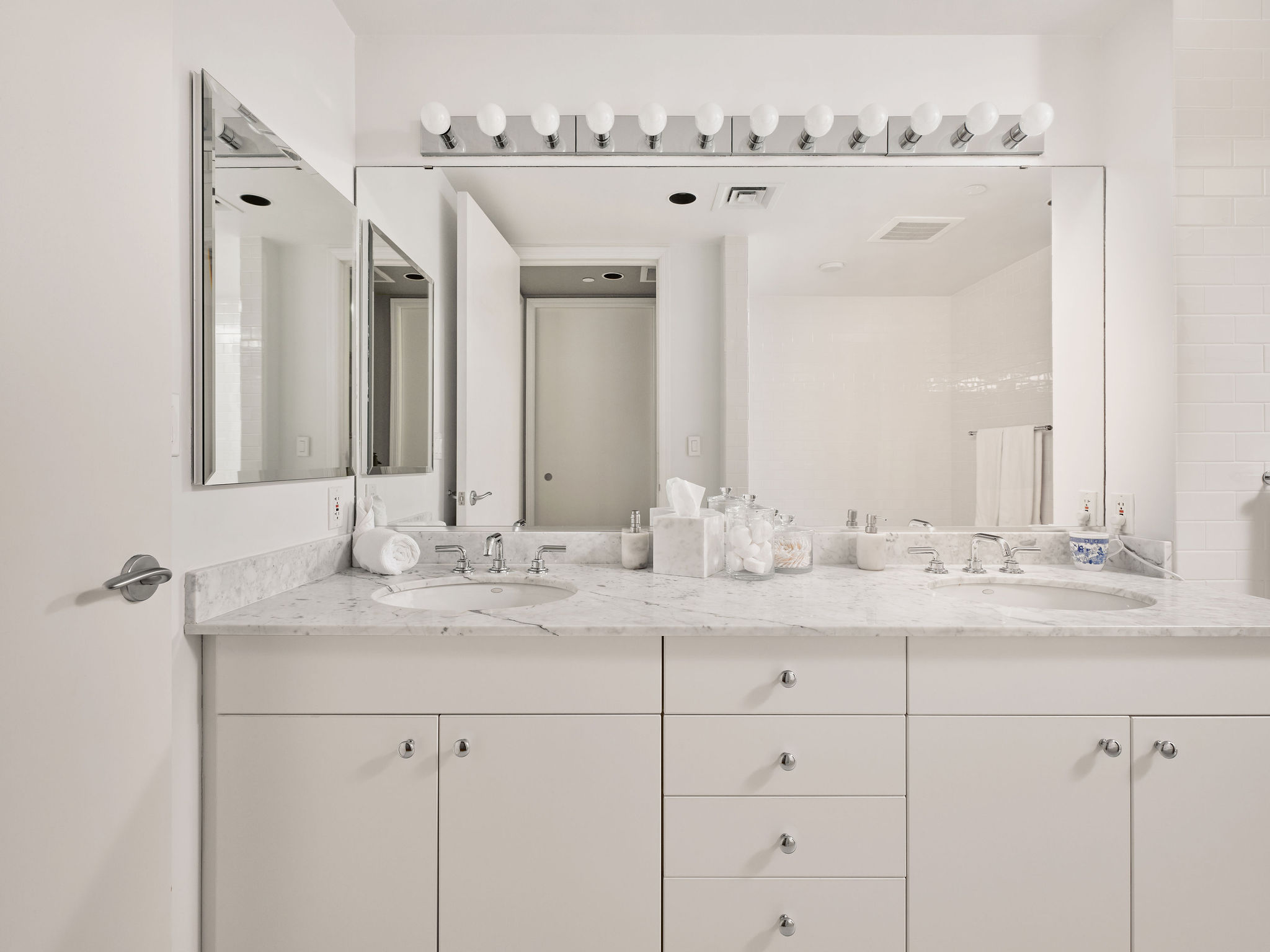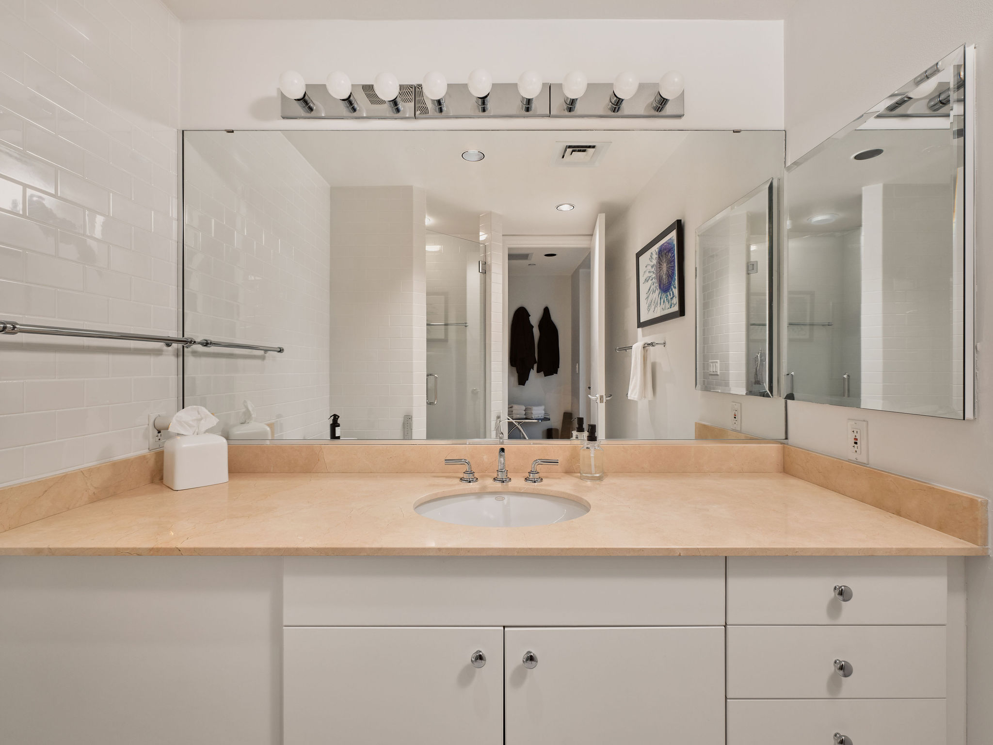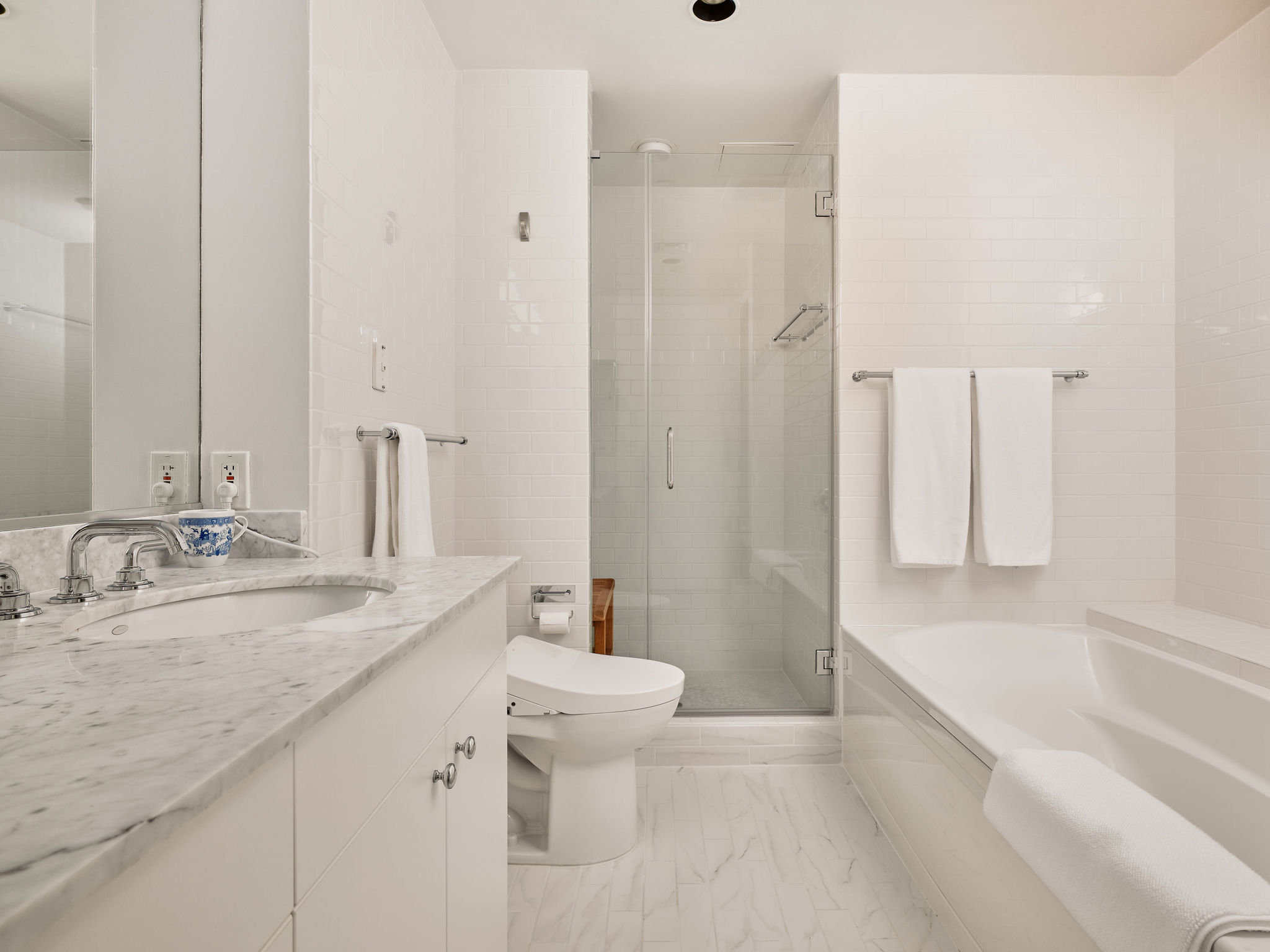 This refined 2-bedroom, 2.5-bath residence with a dedicated office has been recently refreshed throughout. Light-filled living and dining areas flow seamlessly into a thoughtfully remodeled kitchen featuring Cambria Ironsbridge quartz countertops, Wolf gas range, a center island, and breakfast bar—ideal for both everyday living and entertaining.